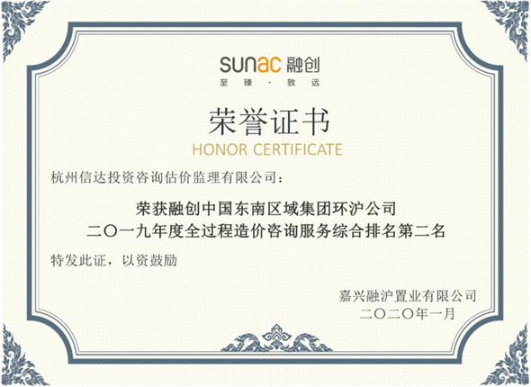 融創(chuàng)中國東南區(qū)域集團環(huán)滬公司2019年度全過程造價咨詢服務(wù)綜合排名第二名
