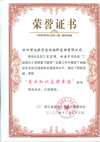 浙江省建設(shè)工程造價管理協(xié)會“專業(yè)知識支撐單位”榮譽證書